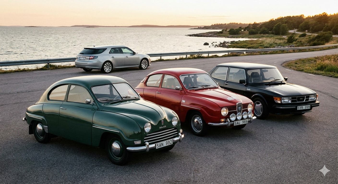 - Saab 92 (1949–1956): Den första serietillverkade bilen. Med en extremt aerodynamisk form (för sin tid) och en tvåtaktsmotor lade den grunden för märkets identitet.
